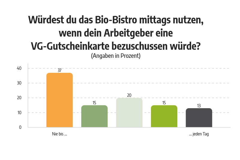 Unsere Bistros sind für fast die Hälfte von euch (49 %) ein gelegentlicher bis täglicher Anlaufpunkt. Besonders spannend: Viele würden das Bistroangebot häufiger nutzen, wenn ihr Arbeitgeber eine Bezuschussung über Gutscheinkarten ermöglichen würde. Wir prüfen derzeit die an uns herangetragenen Möglichkeiten. Gleichzeitig möchten wir euch ermutigen, auch selbst das Gespräch mit euren Arbeitgebern zu suchen: Über den steuerfreien Sachbezug gibt es schon jetzt die Möglichkeit, Mittagessen zu unterstützen. Fragen könnt ihr gern per Mail an info@vg-dresden.de senden.
