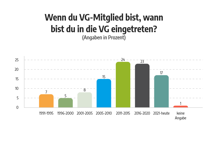 Rund 10.000 Mitglieder tragen die Verbrauchergemeinschaft Dresden – viele davon schon seit vielen Jahren. Fast die Hälfte ist zwischen 2011 und 2020 eingetreten. Diese Treue freut uns sehr. Gleichzeitig zeigt die Umfrage: Die aktivste Altersgruppe liegt derzeit zwischen 46 und 60 Jahren. Das nehmen wir als wichtigen Impuls, die VG künftig auch für jüngere Menschen und Neuzugezogene in Dresden noch sichtbarer und attraktiver zu machen. Eure Weiterempfehlung hilft uns dabei sehr.