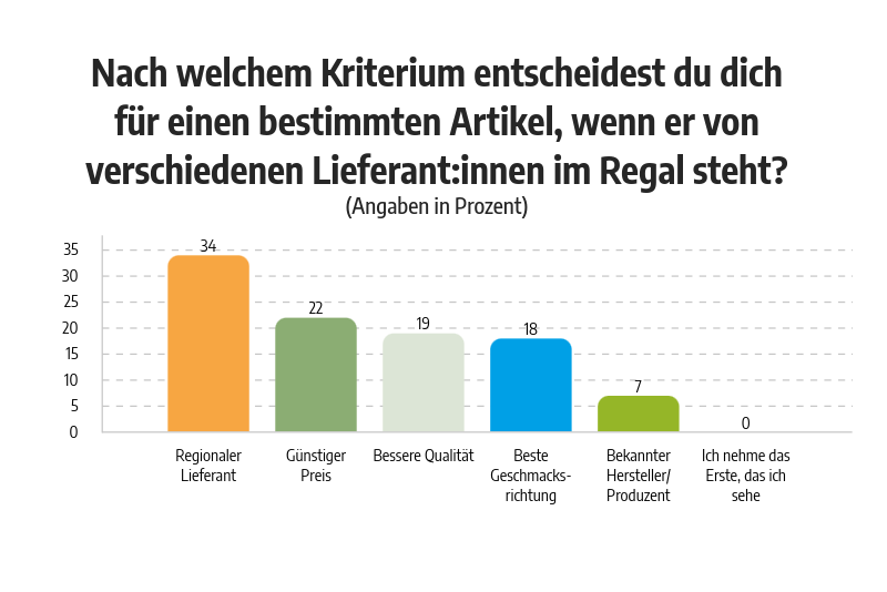 Was uns besonders freut: 91 % von euch finden bei uns (fast) alles, was sie für den Alltag brauchen. Das wichtigste Kriterium beim Einkauf ist für euch mit 34 % ganz klar die Regionalität der Lieferanten. Dieses Anliegen teilen wir voll und ganz und werden auch weiterhin großen Wert darauf legen, möglichst viele Produkte aus der Region anzubieten.