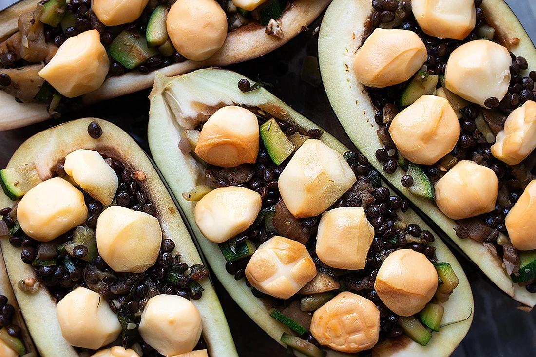 5. Die Gemüse-Linsen-Mischung in die Auberginen geben, Scamorzetti Affumicate darauf verteilen. Im Ofen 15-20 Minuten lang backen. Anschließend herausnehmen und noch warm servieren.