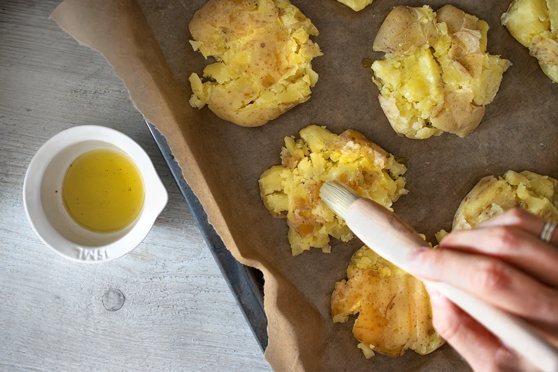 Ein Backblech mit Backpapier auslegen und den Backofen auf 200 °C Ober- / Unterhitze vorheizen. Die abgegossenen Kartoffeln auf das Blech geben und mit einem Glas oder mit einem Kartoffelstampfer zerquetschen, bis sie etwa 1 cm hoch sind. Mit Olivenöl bestreichen und mit Salz und grünem Pfeffer würzen. 30-40 Minuten knusprig im Ofen backen.