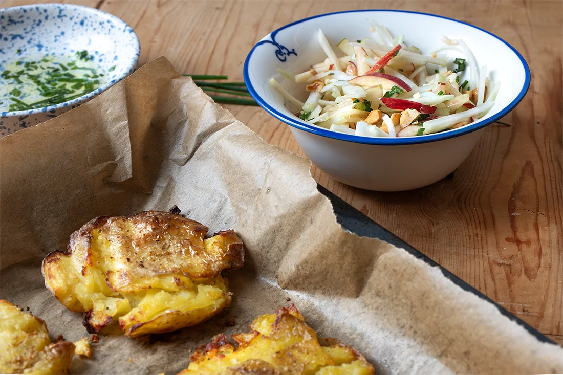 Smashed Potatoes mit Kohlrabi-Apfel-Salat