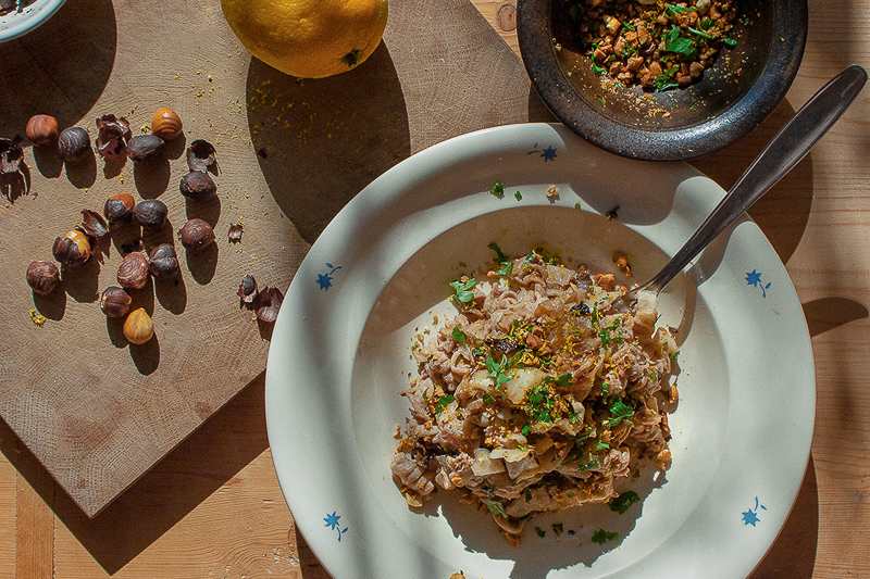 Für diese Version nutzen wir Spitzkohl, den Ihr in den VG-Märkten im Herbst von verschiedenen unserer Regionallieferant:innen erhaltet. Kombiniert mit nussigen Dinkelvollkorn-Nudeln und einer cremigen Sauce mit Haselnüssen, Steinpilzen und einem Schuss frischer Zitrone wird er zu einer leckeren Hauptmahlzeit.